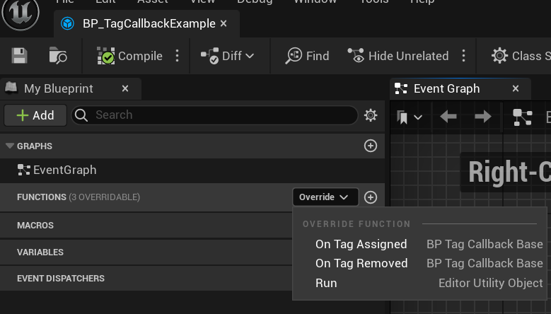 In this blueprint, you have to override the method you need, either “OnTagAssigned” or “OnTagRemoved” ( or both ):