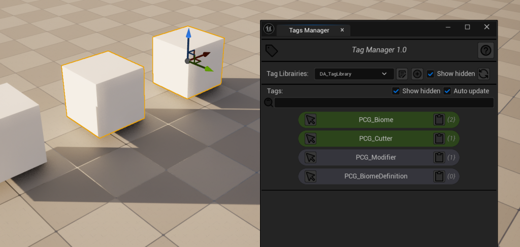 Tag: The actual tag value ( the string which will be used as tag ), library prefix might be added. TagDescription: (optional) The description of the tag, will be displayed as tooltip. Deprecated: Will turn the tag deprecated, that means it will still be shown in the list of tags, and can be removed from actors, but not added. EnableLibraryCallback: If True and a library callback is set, then it will be executed, otherwise the library callback will be skipped for that tag. EnableTagCallback: If True, it will execute the callback ( if any ) set on that tag. The tag callback will be executed after the library callback ( if any ). BPCallback: (optional) The callback blueprint to be executed. It must be of type BP_TagCallback_Base more on that bellow. Hidden: If True, the tag will be hidden from the tags list. (Unless “Show hidden” is checked)