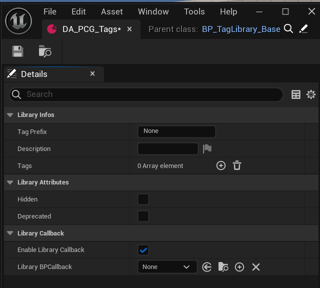 Tag Prefix: (optional) A string prefix which will be prepend to any tag value of the library. Description: (optional) A string that describe the library, it will be displayed as a tooltip on the drop down menu of the libraries selection. Tags: The list of tags to be assigned in that library. Hidden: If True, the library will be hidden from the selection menu. (Unless “Show hidden” is checked) Deprecated: Will turn all the tags of the library to deprecated ( see tag options bellow for more infos ). Enable Library Callback: Enable the callback which will be run on any of the tags assignation / removal of this library. Library BPCallback: (optional) The callback blueprint to be executed. It must be of type BP_TagCallback_Base more on that bellow.